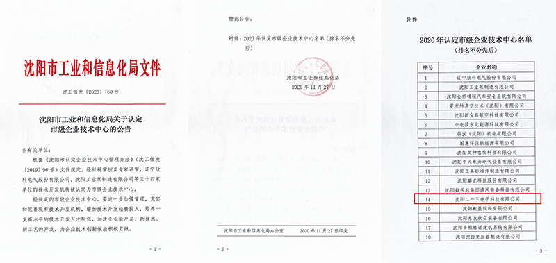 11月27日沈阳市工业和信息化局发布了《关于认定市级企业技术中心的公告》,沈阳二一三电子科技有限公司等三十四家单位的技术开发机构被认定为市级企业技术中心。