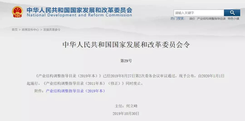 《产业结构调整指导目录(2019年本)》已经2019年8月27日第2次委务会议审议通过,现予公布,自2020年1月1日起施行。