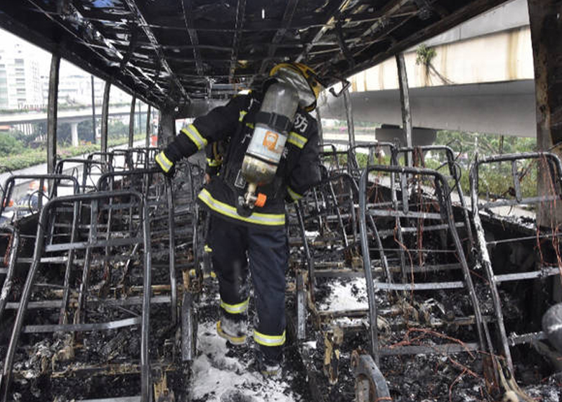 中队到达现场后,发现现场有很多围观群众,对交通造成了诸多不便,在将人群疏散开以后,指挥员立即对现场作出侦查:现场一辆大巴车停靠于右车道,大巴车已经全部过火,火势正处于猛烈燃烧阶段,该大巴着火部位为车尾部发动机处,火势已将顶盖烧穿且已经燃烧到车内。