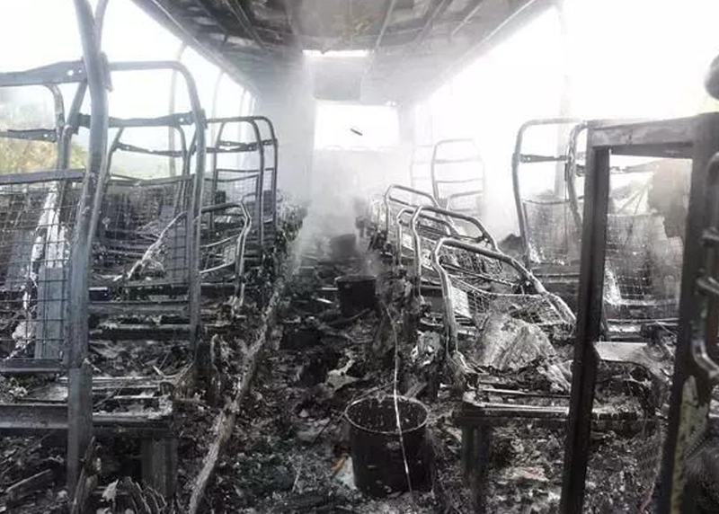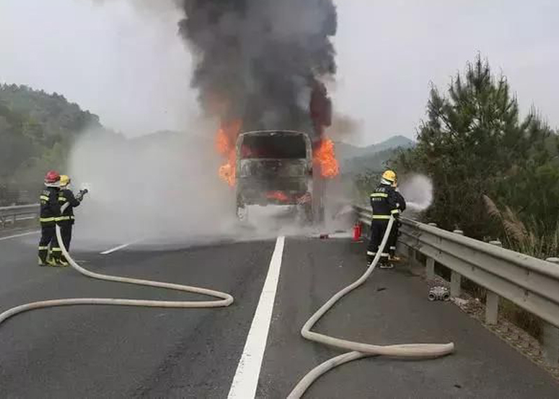 消防员到达现场后,发现大客车整个车身已被熊熊大火吞没,车尾处左右两个油箱正往外喷火,大火还引燃了高速旁的山地,火势向周围蔓延。根据现场情况,指挥员立即命令灭火组开始扑救,一只水枪对着着火客车,另一只水枪向山地进行灭火,40分钟后明火被彻底扑灭,经过搜寻,大巴车内无人员被困。