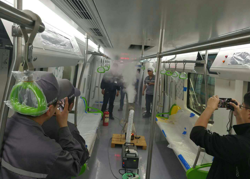 2018年5月24日,在中车大连机车车辆有限公司的组织下,公安部沈阳消防研究所、沈阳地铁监理等单位的相关人员,在中车大连机车旅顺基地静调车间共同完成了我司轨道交通火灾探测及细水雾灭控火系统在沈阳地铁十号线首列车SYM1001上进行的火灾烟雾探测型式试验。