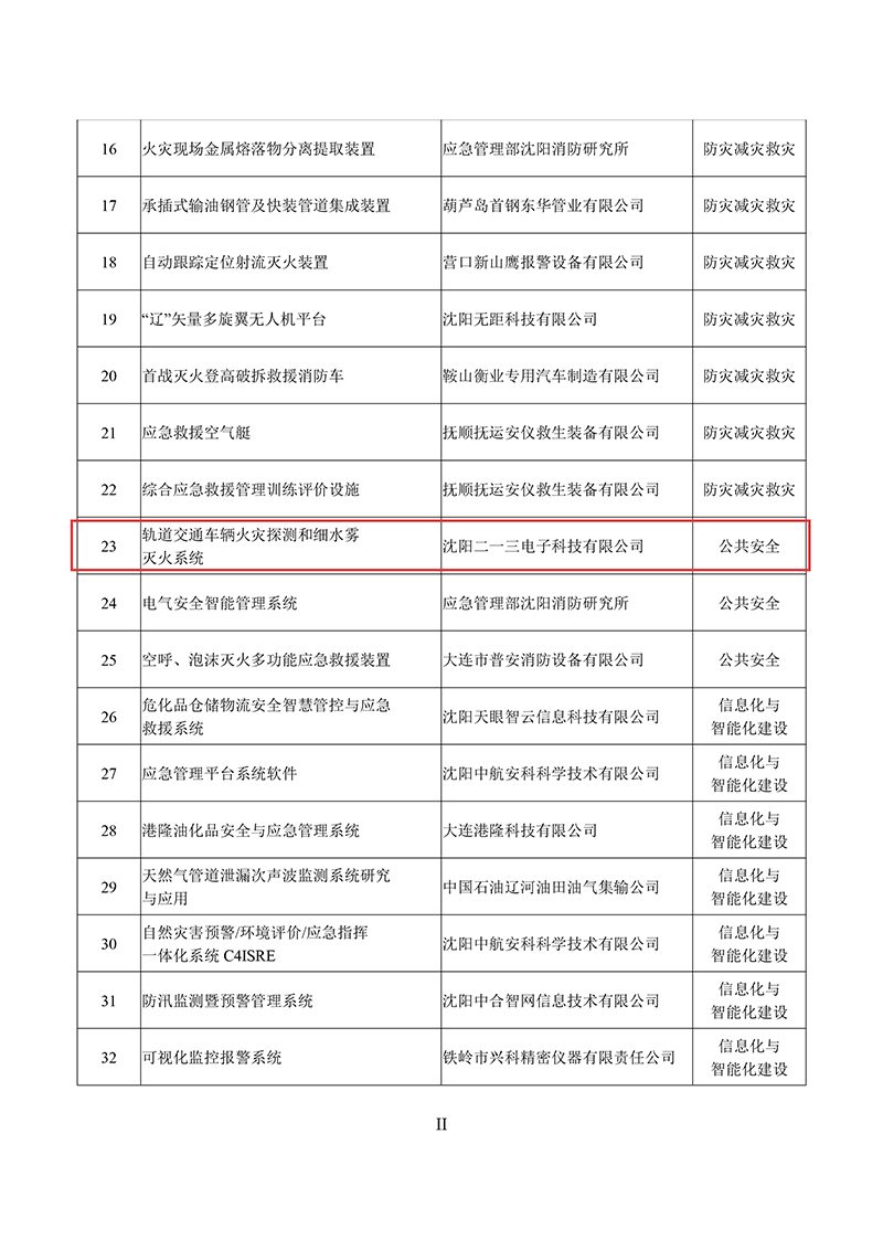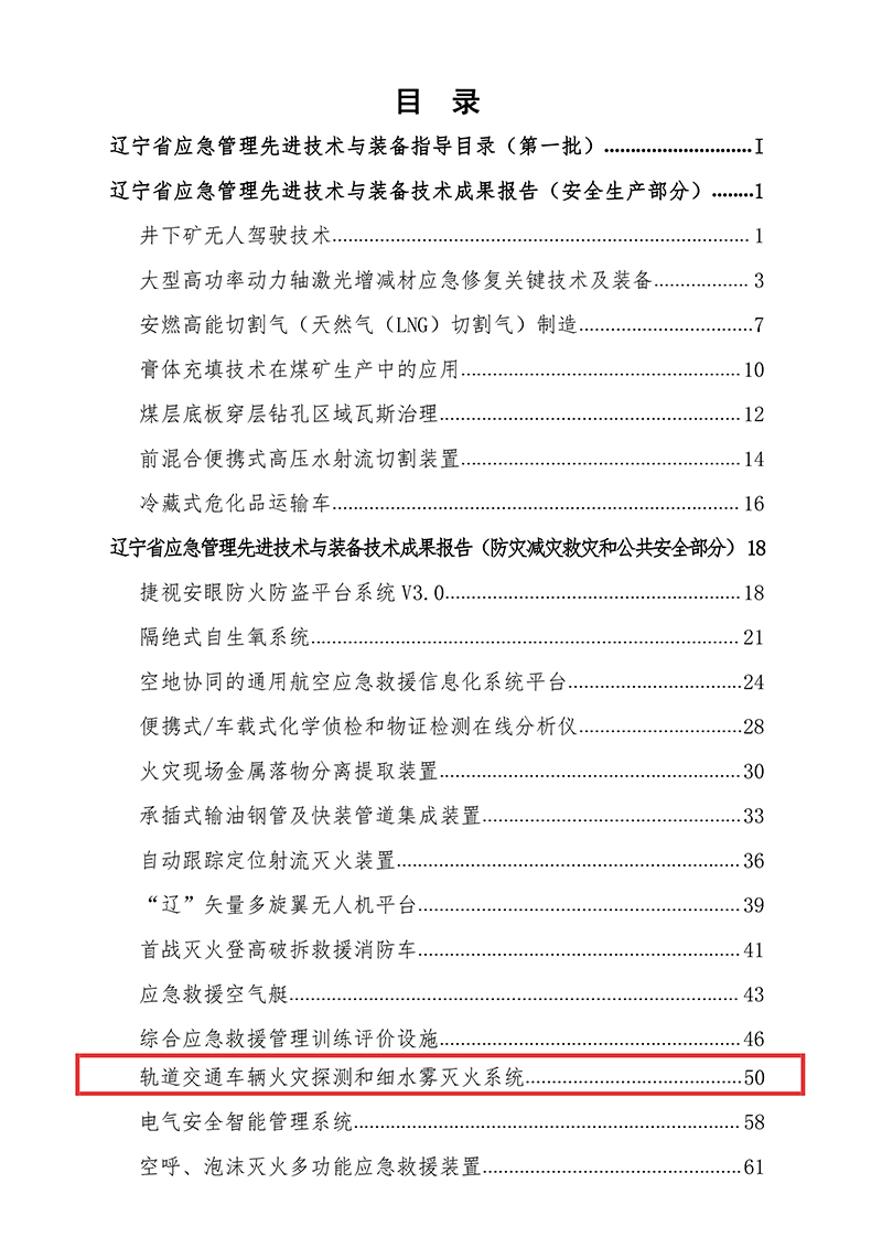 2019年11月,我公司轨道交通车辆火灾探测和细水雾灭火系统产品被辽宁省应急管理厅和科学技术厅纳入《辽宁省应急管理先进技术与装备指导目录(第一批)》。我公司积极响应省委、省政府强化安全生产号召,依靠科技进步,推动应急管理先进技术与装备推广及应用,提升我省应急管理保障水平和能力,为公共出行安全提供先进保障。