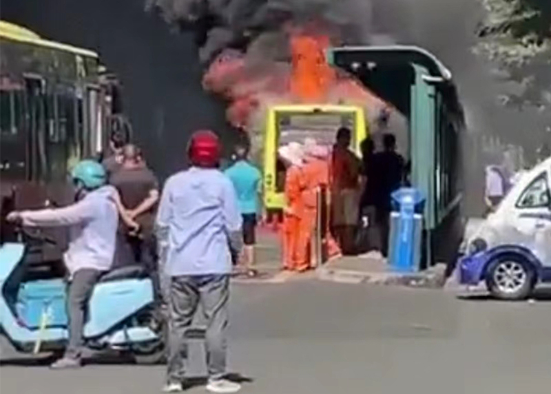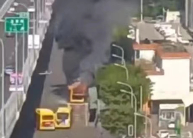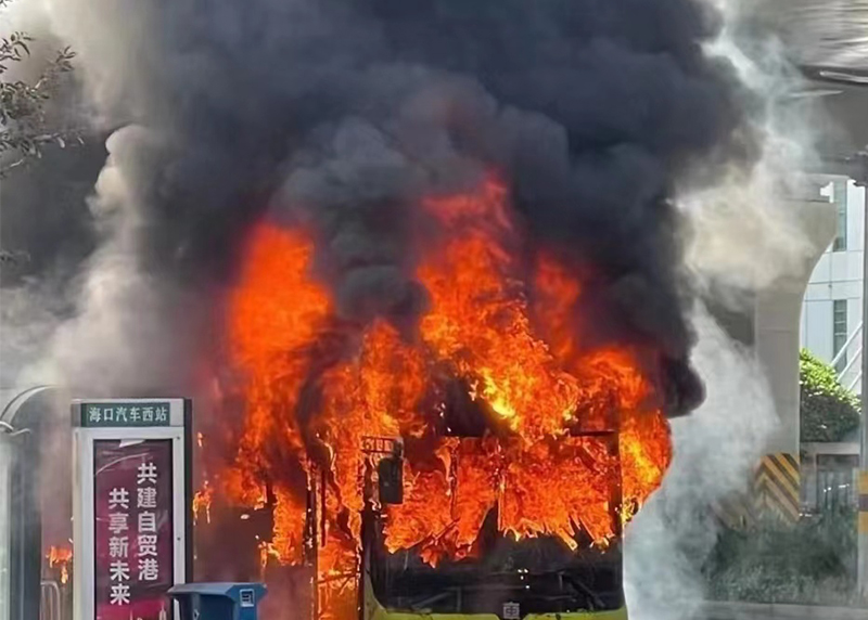 因高压电池起火,火势较大,车辆燃烧速度较快,公交车所有的消防器材全部使用完毕后均无法将火扑灭,随后119消防队员到场,将火势控制并最终扑灭,该自燃事件未出现人员伤亡。目前,起火原因仍在调查中。
